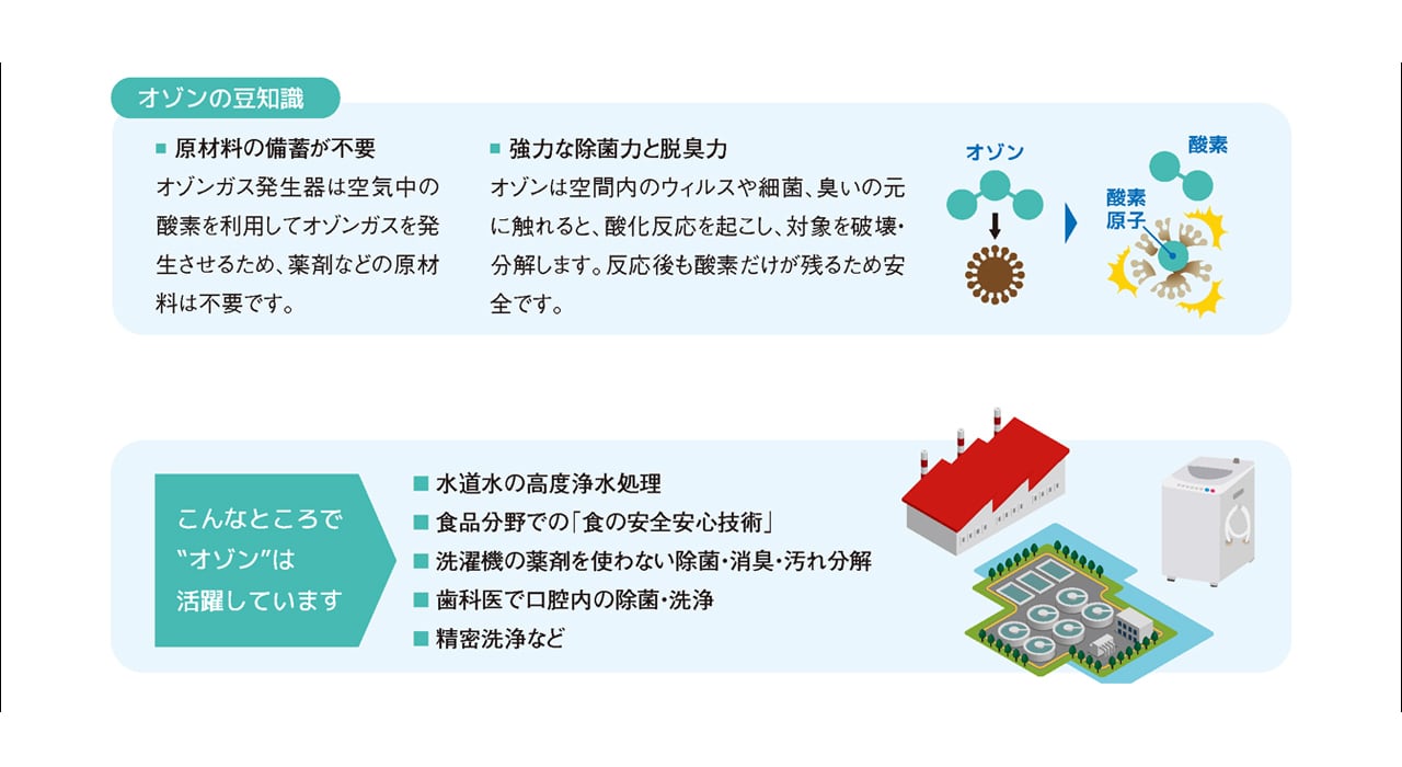 空間だけではなく、家具・壁・床・天井などに付着した菌やウイルス対策のプラスにオゾンの力をプラスしませんか。
